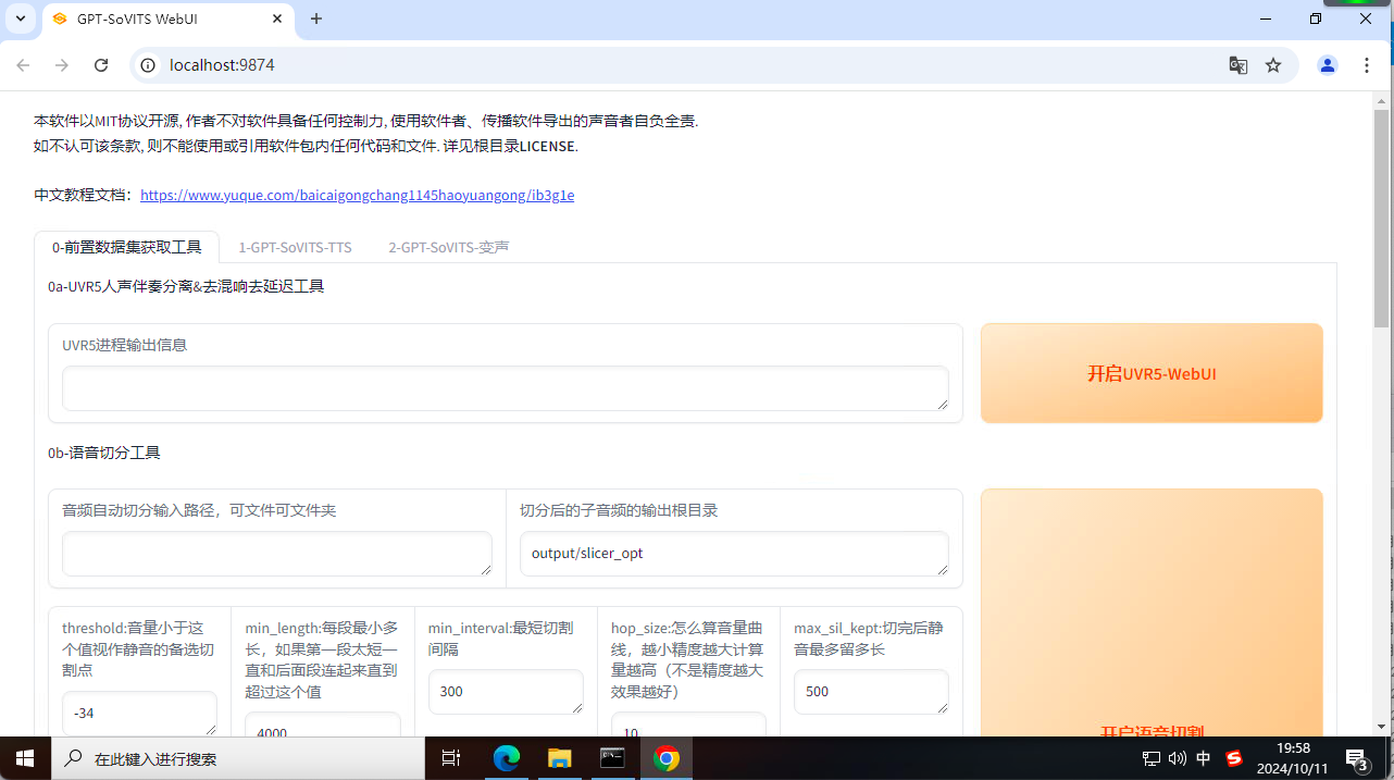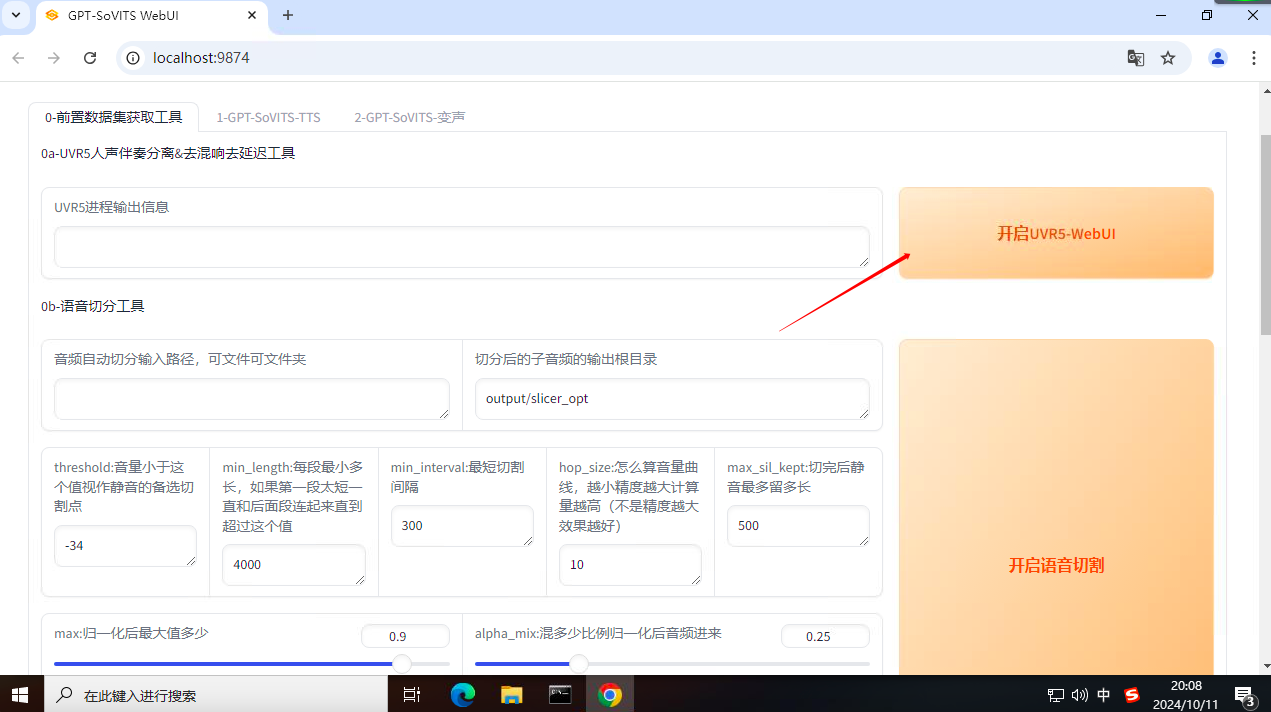 首先输 入原音频的文件夹路径(不要有中文),如果刚刚经过了UVR5处理那么就是uvr5_opt这个文件夹。然后建议可以调整的参数有min_length、min_interval和max_sil_kept单位都是毫秒。
