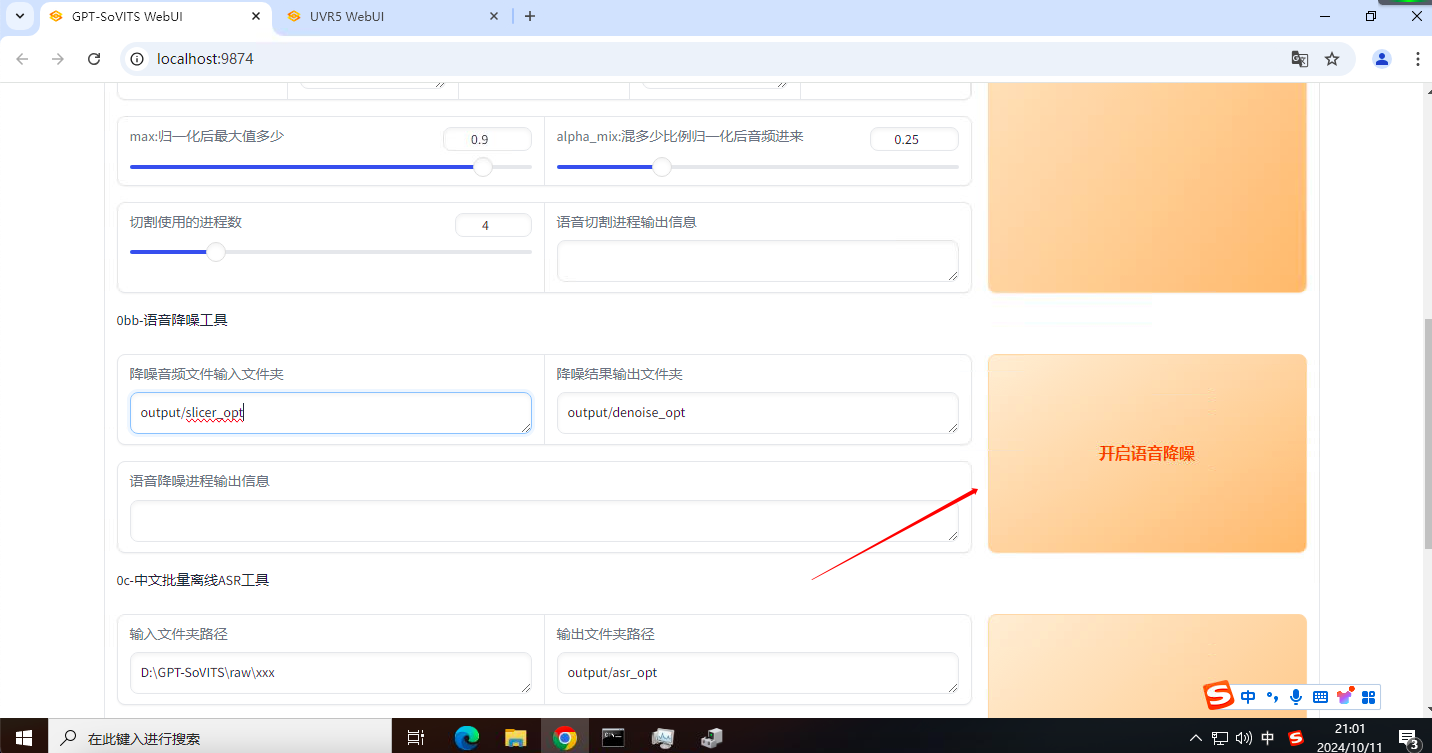 输入刚才切割完音频的文件夹,默认是output/slicer_opt文件夹。然后点击”开启语音降噪“。默认输出路径在output/denoise_opt。