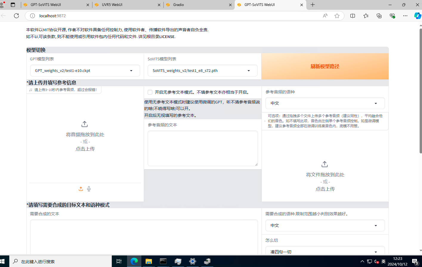 最上面可以切换模型,选择刚才训练出来的模型即可。然后上传一段参考音频,建议是数据集中的切割音频。最好5秒,并输入字幕。