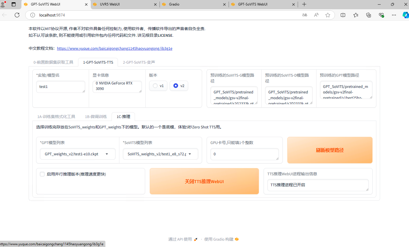 先点一下刷新模型,下拉选择模型推理,e代表轮数,s代表步数。不是轮数越高越好。选择好模型点开启TTS推理,自动弹出推理界面。如果没有弹出,复制控制台最下面的链接 在浏览器里打开。