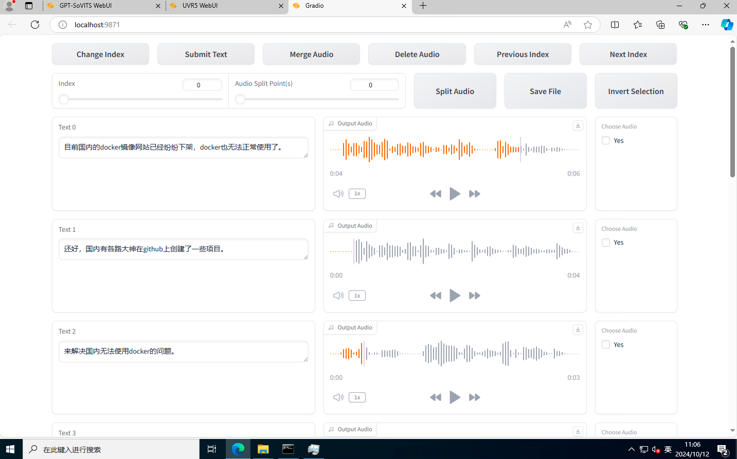 打开后就是SubFix,从左往右从上到下依次意思是:跳转页码、保存修改、合并音频、删除音频、上一页、下一页、分割音频、保存文件、反向选择。每一页修改完都要点一下保存修改(Submit Text),如果没保存就翻页那么会重置文本,在完成退出前要点保存文件(Save File),做任何其他操作前最好先点一下保存修改(Submit Text)。删除音频先要点击要删除的音频右边的yes,再点删除音频(Delete Audio)。删除完后文件夹中的音频不会删除但标注已经删除了,不会加入训练集的。