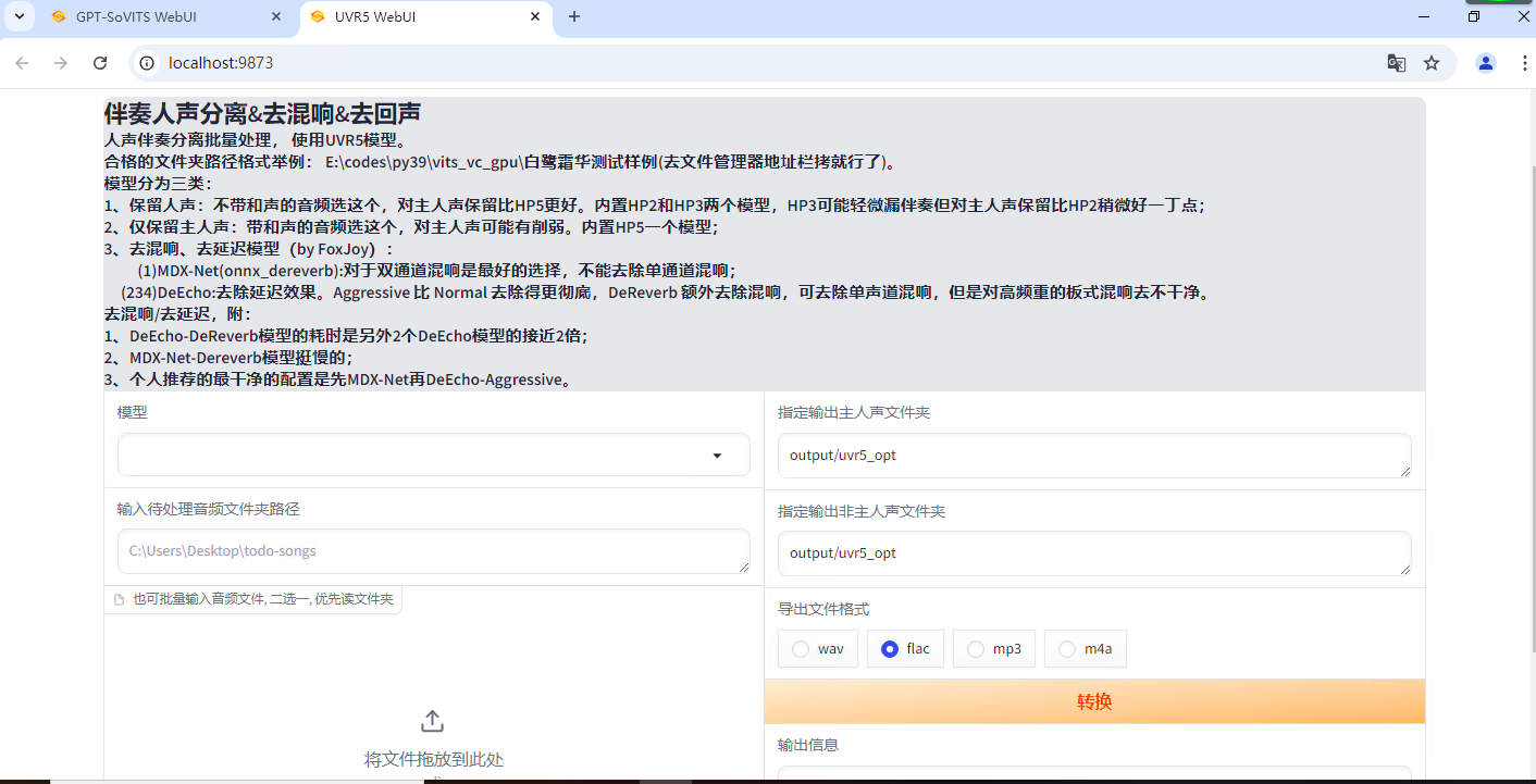 输出的文件默认在GPT-SoVITS-beta\output\uvr5_opt这个文件夹下。处理完的音频(vocal)的是人声,(instrument)是伴奏,其他都可以删除。结束后记得到WebUI关闭UVR5节省显存。